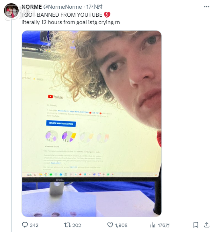 只是对于Norme来说,他现在并没有时间和脑力思考这些问题——在不眠耐久挑战结束后,这位博主已经马不停蹄地在Twitch开启了“世界最长睡眠时间”的挑战。