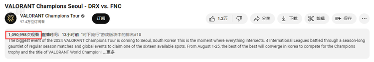CJ结束后,2024年无畏契约全球冠军赛也在韩国首尔如火如荼地进行中,四大赛区(包括VCT CN赛区)共16支队伍参与角逐,比赛悬念丛生。即便现在仍处于小组赛阶段,比赛直播和视频的国内外收视人数都相当可观。