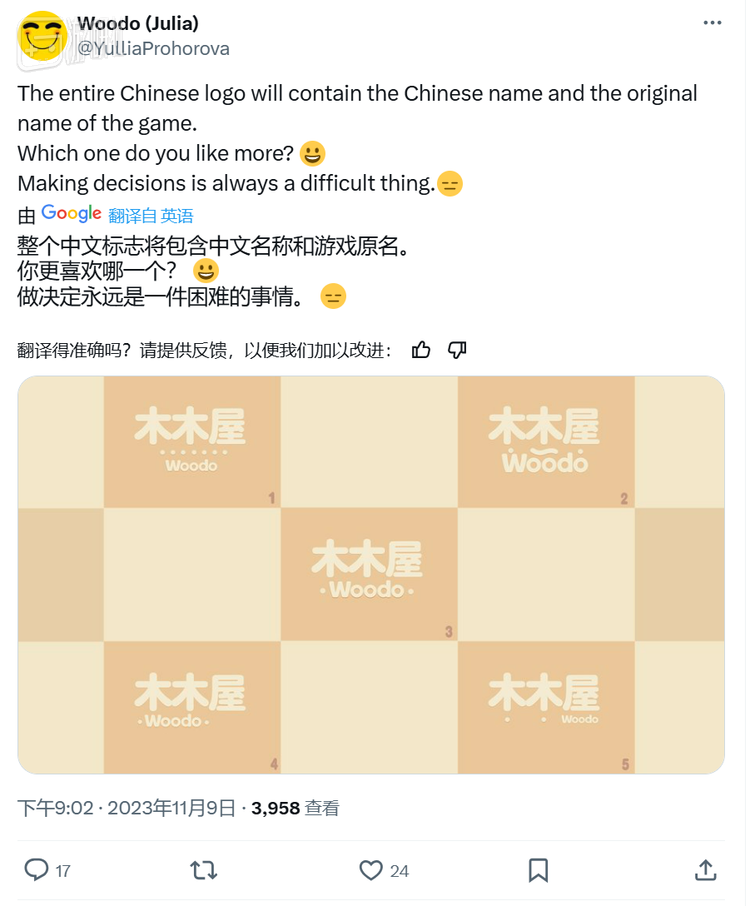 《Woodo》如今的中文译名是《木木屋》。实际上游戏作者不仅亲自参与了为游戏起中文名,还特意设计了多个中文Logo,由玩家来票选出用于游戏内的样式。