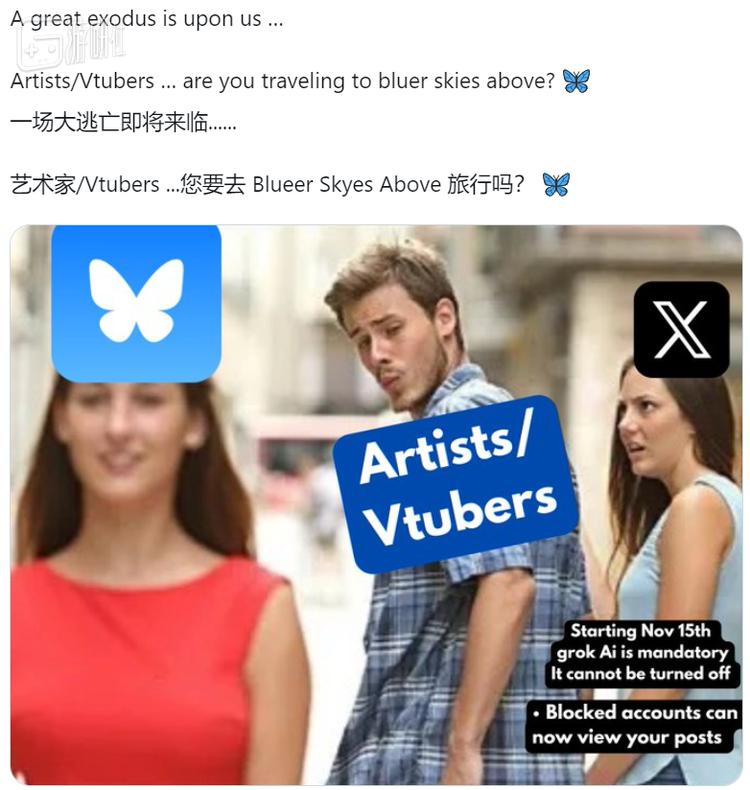 最近几天的X(Twitter)平台有个新趋势,很多游戏开发者、画师都在逃离X,转移到Bluesky平台,它的蓝色蝴蝶logo,也成了某种象征着自由的符号。