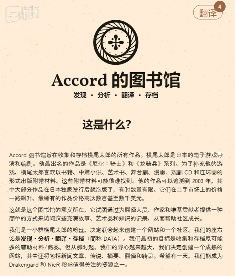 Accord's Library是一个专门存档横尾太郎本人及相关作品资料的网站,自从2021年上线以来,一直运营至今,所存档的资料包括不限于横尾太郎的新闻报道、采访对谈、《尼尔》《龙背上的骑兵》等游戏原画、衍生漫画、广播剧、小说……