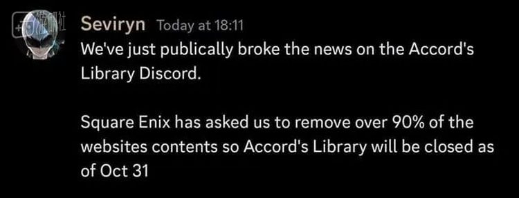 10月16日,Accord's Library的管理员通过Discord向所有用户传达了这一消息:“我们很遗憾地通知大家,Square Enix法律团队已经联系了我们。虽然我们也非常不舍,但必须尊重对方的意愿,Accord's Library 将在本月31日彻底关闭。”