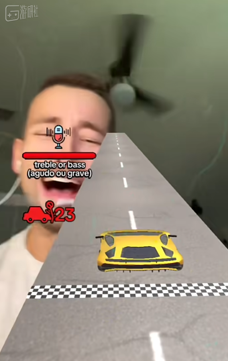 一辆小车开在一条设置有许多障碍物的路上,背景中的老外忽而发出尖锐爆鸣,忽而发出低沉咆哮,极其富有喜剧效果。小车也随着声音高低伸缩自如,通过一系列障碍,最终成功达到终点。这并非喜剧表演,而是TikTok上流行的声控小游戏。