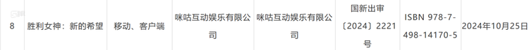 另一方面,依据此次披露的过审信息,《胜利女神:新的希望》由咪咕担任出版与运营单位,而不是大家预想中的腾讯。