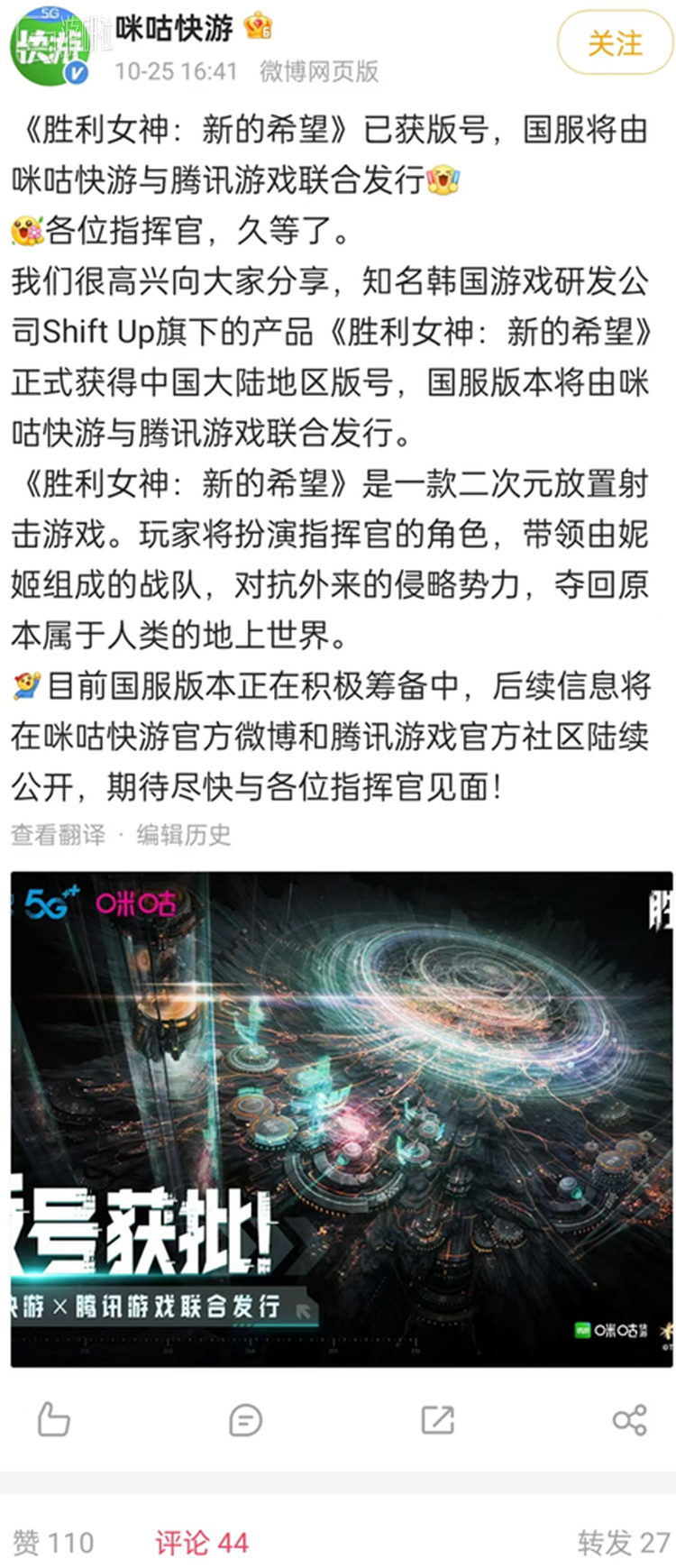 但很快,咪咕快游官方账号在微博上确认了《胜利女神:新的希望》就是游戏的大陆地区版本。大家的态度便从疑惑转向了“活久见”。