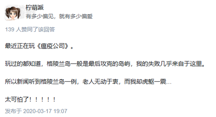 这条转发所获得的点赞和关注远超原本的新闻,原因也很简单——格陵兰岛是这个玩法在于传播病毒的游戏中最难攻克的地区,缘由之一就是该地区缺少航班。《瘟疫公司》的转发,让这条普通的新闻变得更像是一则地狱笑话。