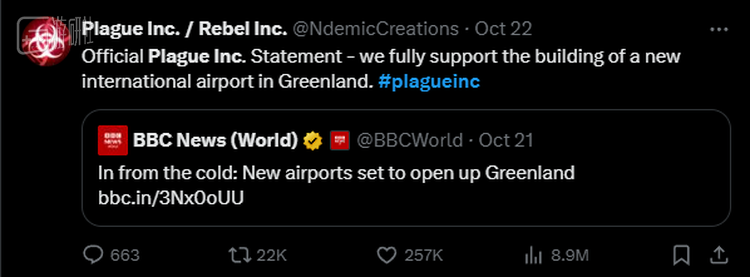 前两天,游戏《瘟疫公司》的官方账号在X转发了一条新闻——格陵兰岛即将建立新国际机场,并留言表示“全力支持”。