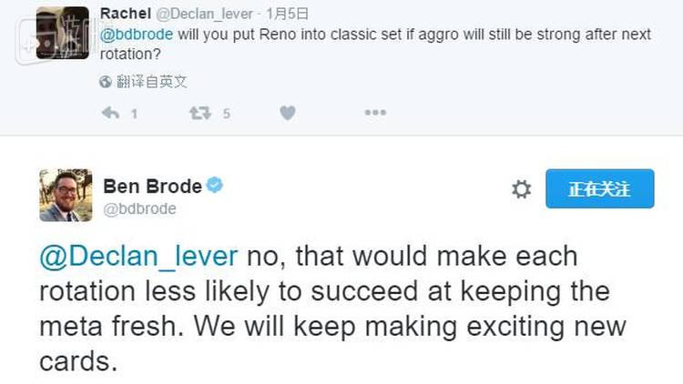 (上图对话)玩家:Ben Brode,如果退环境后快攻依然猖獗,你会考虑把雷诺加入经典卡行列中吗?
