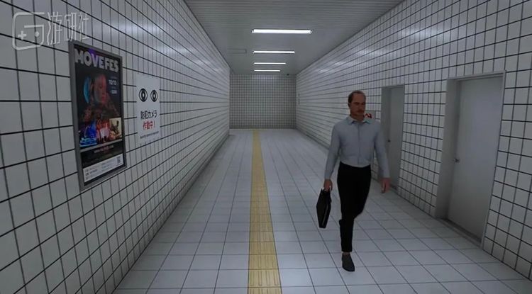 玩家扮演的角色困在地铁站台通道里,有个奇怪的地中海发型上班族大叔正在走过来。由于采用虚幻5引擎制作,画面有着高度写实的观感,很贴合流行的后室、阈限空间风格。