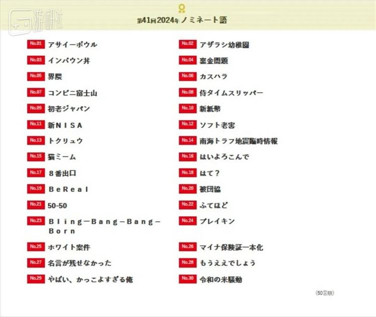 候选名单一共有30个词语,大多数来自综艺娱乐或者社会话题。像是“柔软老害”(ソフト老害)描述了一种职场现象,指的是有一定资历的人假装身段很软、愿意亲近年轻人,实际上是给年轻人灌输古板过时的观念。