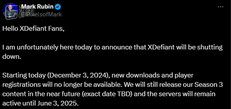 2024年12月3日,育碧旗下FPS游戏《不羁联盟》(XDefiant)的执行制作人Mark Rubin在X上发布了一封给玩家的信,称游戏即将关停:
