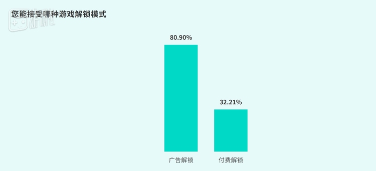 “广告解锁”模式受欢迎度达80.9%,远超“付费解锁”的32.21%,反映出玩家更倾向于低成本解锁游戏内容,对游戏内购持审慎态度。