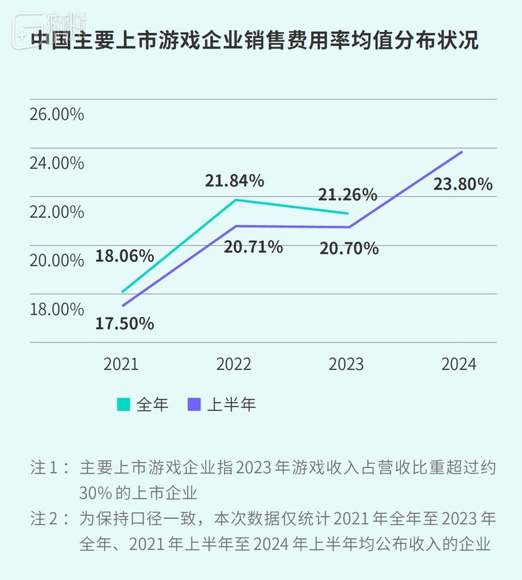 除了广告创意数量提升,游戏企业营销花费也在持续上涨。根据伽马数据统计,中国上市游戏企业销售费用率均值已升至23.8%,获客成本仍在攀升。虽然许多厂商已经尝试新手段,但竞价广告“内卷”情况依然存在,营销费用高进一步压缩企业利润空间。