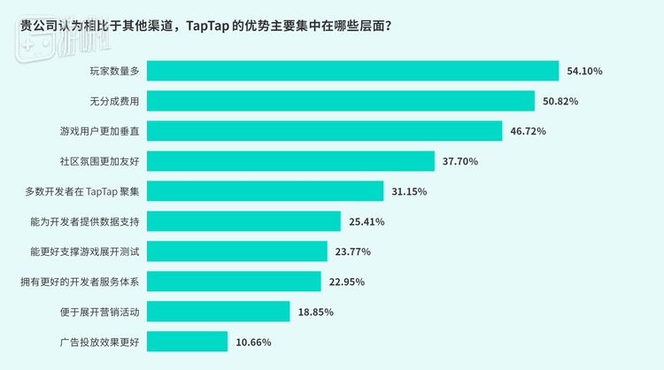 游戏企业制定营销策略时,渠道选择至关重要。企业首先在意的是渠道的用户体量与质量,因此营销预算更多投向用户规模庞大且能筛选目标用户的大型游戏渠道。51.6%的企业重视分成比例,游戏利润下滑的情况下高额分成便成为负担,故企业会倾向低分成渠道配合其营销。TapTap作为0分成渠道,能有效的提升开发者利润率。因此,平台和渠道需具备复合能力,满足游戏企业营销与衍生需求。
