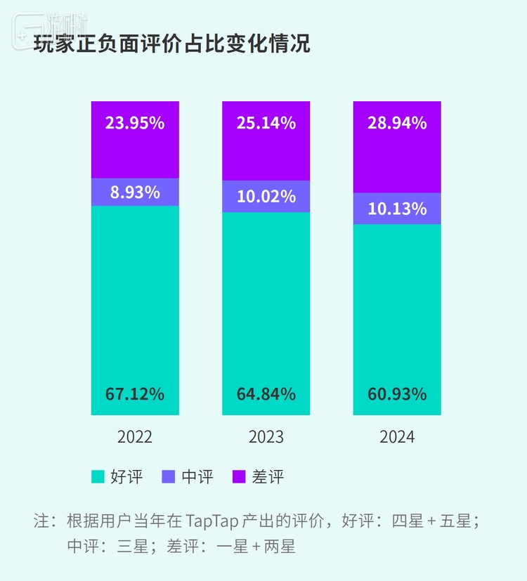 2024年TapTap上游戏产品正面评价占61%,负面占29%,相比2023年正面评价略降,整体评价下滑,反映用户需求上升。