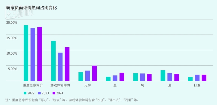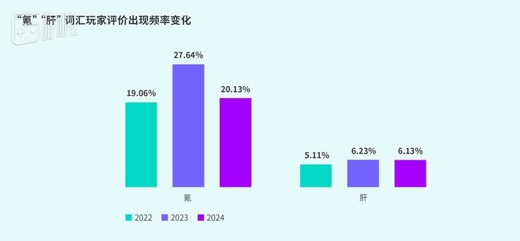 “氪”讨论度在2023年达峰值27.64%,2024年依然较高,“肝”出现频率持续在5%以上。此外,“无聊”频率快速上升,玩家易疲倦于重复内容,需开发者提升内容新鲜度。