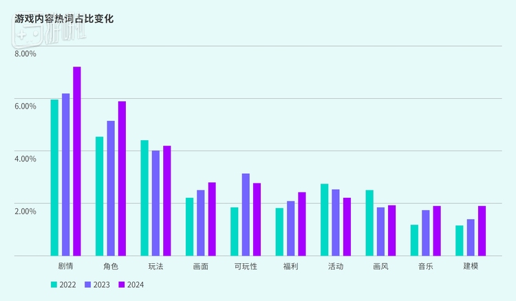 从TapTap用户对游戏内容的关注度来看,“剧情”出现频次最高,反映玩家对游戏体验要求提升。