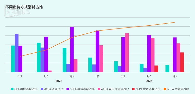 在2023-2024年期间,广告主通过oCPA出价(智能优化工具)的消耗占比不断提升,越来越多开发者愿意将游戏后链路数据回传给TapTap,通过模型学习后高效地获得优质付费用户,提升广告投产比。