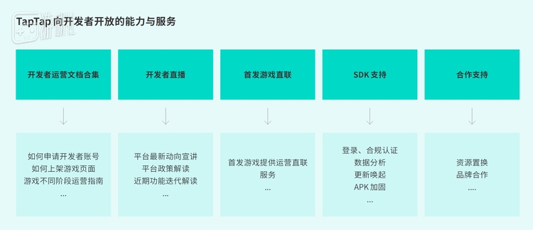 TapTap作为连接开发与玩家间的重要桥梁,为开发者提供了大量产品化能力,通过提供与TapTap生态相结合的技术能力、易用的数据分析、开放用户生态、活动运营工具和合规帮助,解决开发者开发、发行、运营痛点,为开发者提供 预约-测试-上线-长线运营 全生命周期的必要服务。