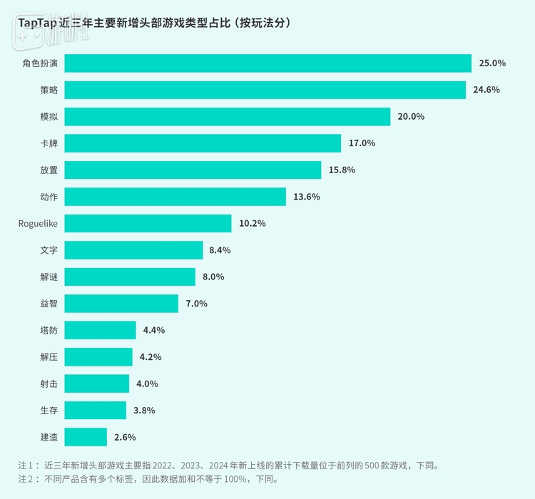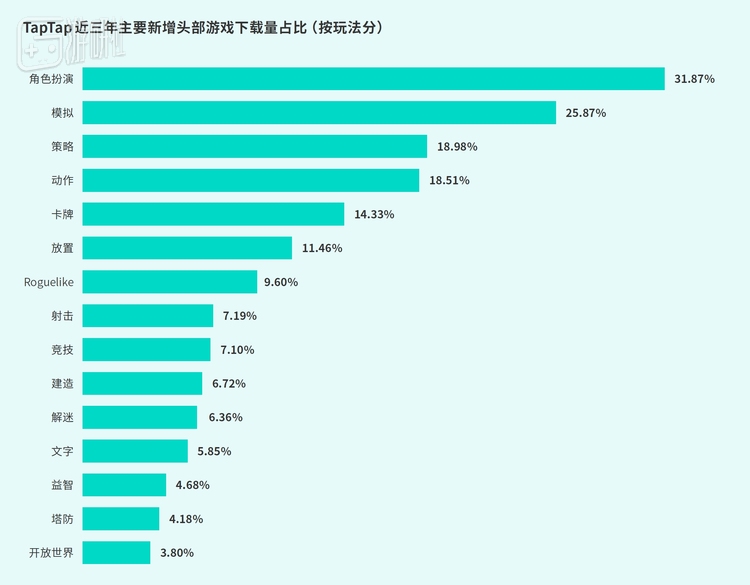 近三年,射击、竞技类游戏新增下载量占比不到10%,由于此类市场相对成熟,大DAU作品占据玩家时长,新品难获玩家,但24年准备充分的《三角洲行动》成功突围。作为对比,角色扮演、模拟、策略品类在新增下载量上表现不错,是TapTap近三年持续成长的品类。