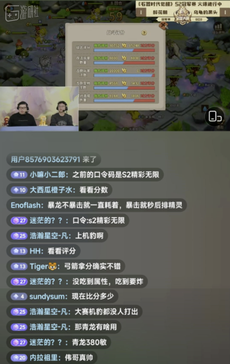 解决这一点的方式说来也不难——在《石器时代:觉醒》的比赛中,官方就请到了玩家社区中人气很高的“猛犸象”和“啊伟 ”两名职业主播来担任解说。两位主播都是游戏的忠实玩家,观众对于他们的游戏理解和职业水平都有着充分的认可。游戏中还使用了可视化的计分板,协助玩家理解场上局势。热闹无比的现场评论区内,也有玩家主动分析局势,给出自己的见解。