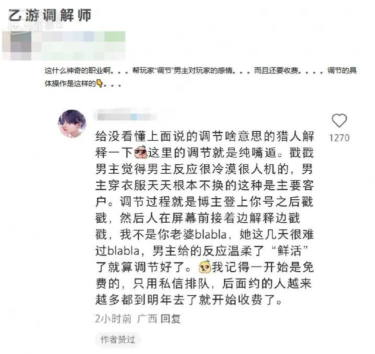 也正是因此,在非乙游玩家乃至部分乙游玩家看来,无论是这个职业,还是请人调解自己与虚拟角色关系的玩家(其中不乏有人为此花费真金白银),乃至整个调节过程,都显得近乎猎奇,甚至有点像江湖骗子跳大神。以至于相关事件评论区出现最多的留言,是“有发财渠道带带我”和“老了可以骗她们买保健品。”