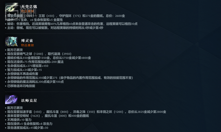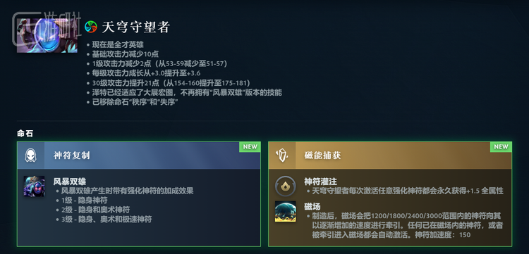 全才英雄得到平衡调整,现在全才英雄的每点属性提供攻击力从0.7减少至0.45,相应的很多英雄的基础攻击力和属性成长有所改变。德鲁伊、狼人、凤凰、发条技师等英雄不再是全才英雄;天穹守望者、死亡先知、幽鬼等英雄加入全才英雄。