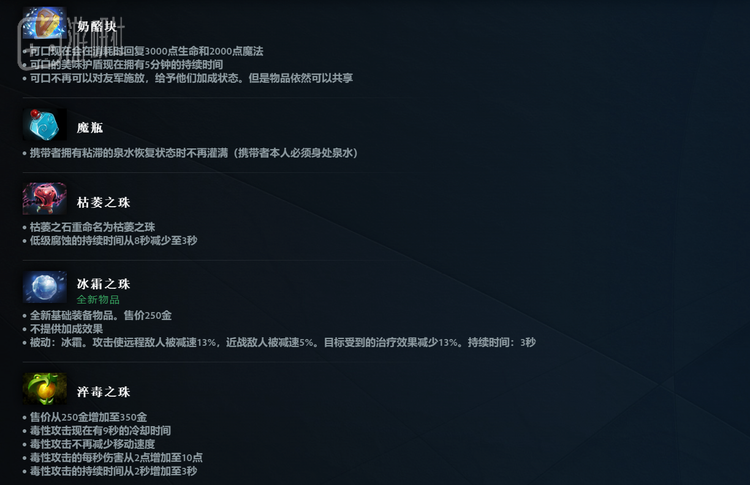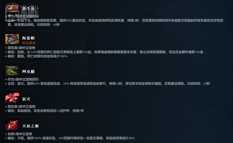 飞贼之刃、精华指环、杂技玩具、天崩、恶牛角、网虫腿等物品作为中立宝物回归,还有一些中立物品在成为中立宝物时行了平衡性修改。