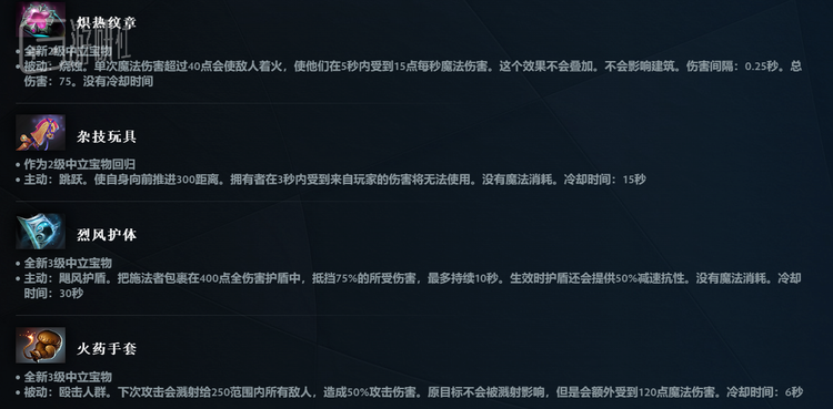 此外,本次更新全新推出魔力药水、蝌蚪护符、撕裂之鞭、炽热纹章、烈风护体、火药手套、锯齿短刀、致残之弩、放大单片镜、皮洛士斗篷、不屈之眼等全新中立宝物。