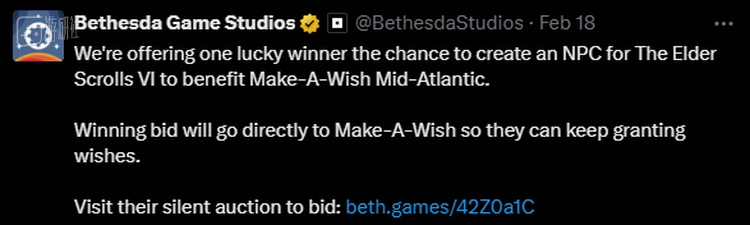 2月18日,贝塞斯达发布了一个慈善竞标项目:只要玩家在许愿基金会中大西洋分会(Make-A-Wish Mid-Atlantic)的沉默拍卖(silent action)里以最低价10450美元参与竞标,最后的赢家就将有机会和B社的开发团队合作,在《上古卷轴6》中创造一个独家NPC。