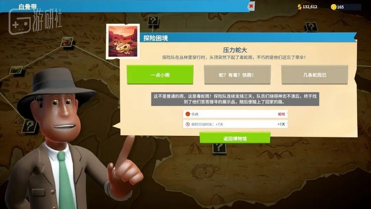 在探险过程中,每个员工都会使用到不同于室内工作的技能属性,还会时不时打电话给馆长求援——有些意外情况,需要玩家指示员工们做出重要的抉择和判断。这些判断会带来不同的结果,轻则大家多在出差的时候摸了一个星期鱼,重则伤痕累累回到博物馆“住院”(真应该跟《双点医院》联动一下)。