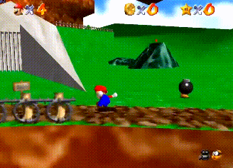 只有当玩家需要「停下来」寻找隐藏道路或奖励的时候,才需要用到C键手动调整视角。发现了吗?在《马力欧64》中,左手负责的移动,和右手负责的动视角,是分开进行的。当玩家左手在跑的时候,右手不用动视角。右手动视角的时候,马力欧一定是站在原地的。