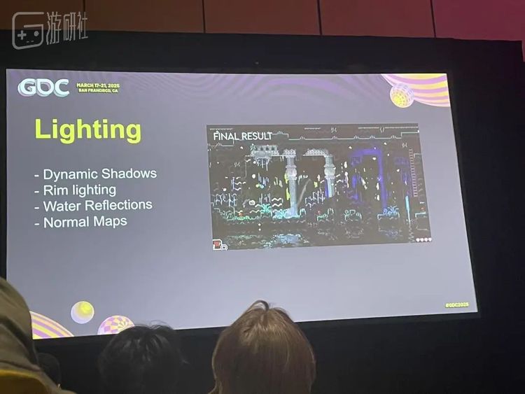 动态阴影:通过在屏幕空间中使用光点数组,并对周围的图块进行相交测试,然后将生成的阴影遮罩渲染到大的精灵调色板上,再进行模糊和抖动处理,最终与场景进行叠加。他还实现了不同图层之间投射阴影的效果,通过将不同的游戏图层渲染到单个渲染目标的不同颜色通道中,然后在渲染背景时采样前景或中景来判断是否需要投射阴影。