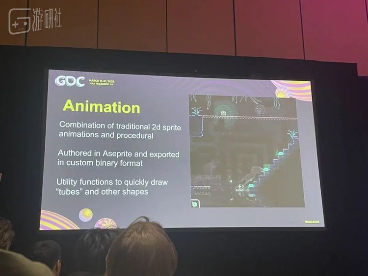 在动画方面,Basso表示他使用软件Aseprite进行像素动画的制作,并且修改了Aseprite程序本身以便导出他自定义的二进制动画格式。他不希望在游戏中使用任何文本字符串,以防止数据挖掘,并且认为解析JSON会涉及动态内存分配,这也是他想要避免的。他的动画格式是以帧和图层的数组形式存储,可以在运行时快速循环播放并根据画布偏移量进行绘制。此外,他还编写了大量的过程化动画函数库,用于创建各种形状和效果,应用于游戏中的许多生物。