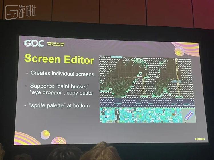 屏幕编辑模式:类似于《超级马里奥制造》的风格,可以在调色板中选择游戏中的精灵并进行绘制,创建游戏中的一个个屏幕。每个图块可以代表一种实体类型,从而在屏幕中生成可移动和更新的游戏对象。