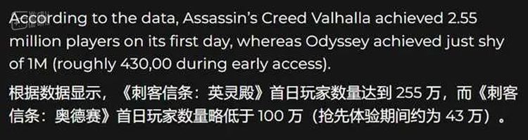Tom Henderson提到的内部数据,来源于育碧自家的数据跟踪工具,具备较可靠的横向参考性。《刺客信条:影》头两天的准确玩家数量为220万,作为对比,《刺客信条:奥德赛》首日玩家数量略低于100万,《刺客信条:英灵殿》首日玩家数量则是255万。