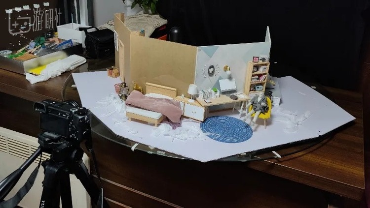 基于同样的理念,游戏的主界面也采用了实景拍摄+逐帧动画的形式。因为许多通用的小摆件没有版权风险,可以直接购买使用,所以整体工程量不算大,从布景到拍摄到后期,总共花费不到2个月。