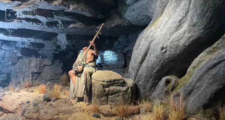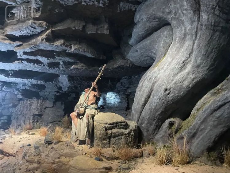其中最让我震撼的,还是“风起黄昏”主题展厅。上百平米的场地,都被布置成了黄风岭的地貌,一个1:1的无头说书人坐在石头上,旁边还摆着个小音响不断播放着“黄风岭,八百里,曾是关外富饶地……”的陕北说书调子。