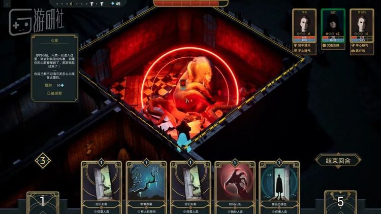 《幽室鬼牌》的玩法本身是比较好懂的:每个回合,各路NPC访客都会尝试向鬼屋更深处探索,而玩家们则要在NPC抵达“心室”之前,用各类卡牌来将他们击杀/逼疯。