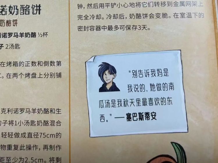 在这本书里,这道秋日菜肴由罗宾分享。在开头,她先是细腻地讲述起了自己小时候在奶奶家品尝南瓜汤的回忆,最后揭露了塞巴斯蒂安的“傲娇”:“我每年都会做几次这种南瓜汤,这是一种祈求好运的传统,包括塞巴斯蒂安的生日。虽然他从不承认,但是我知道他喜欢这道菜!”