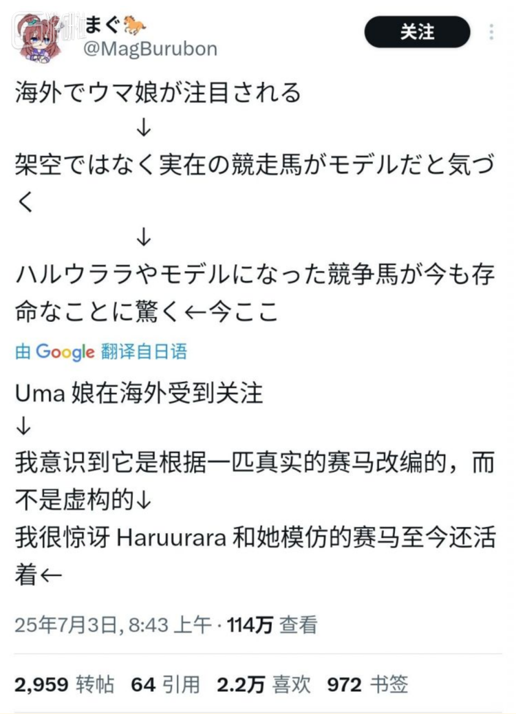 尤其是随着《赛马娘》手游在2021年上线时,“培养乌菈菈,让她拿下一次冠军”成为了游戏最破圈的传播点之一,助力其成为日本的国民级手游之一。