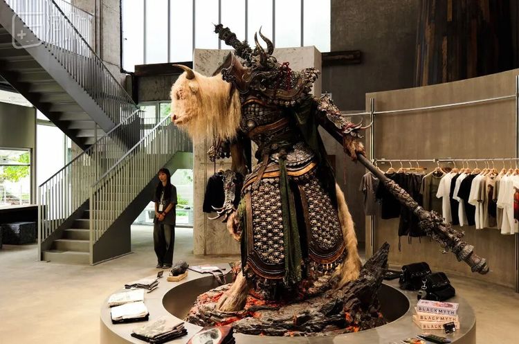 ——不过我没有忘记自己是来购物的。整个店铺分为上下两层,约1000平米,商品区和展品相互穿插,贩售数量最多的应该是黑神话IP的主题服装,这部分线上小程序就能看到图样,这里暂且按下不表(主要是因为我没有模特所以没在现场拍照)。