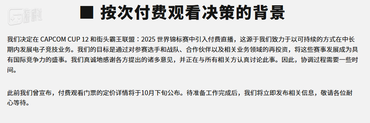 “我们决定在 CAPCOM CUP 12 和街头霸王联盟:2025 世界锦标赛中引入付费直播,这源于我们致力于以可持续的方式在中长期内发展电子竞技业务。我们的目标是通过对参赛选手和战队、合作伙伴以及相关业务领域的再投资,将这些赛事发展成为具有国际竞争力的盛事。我们真诚地感谢各方提出的诸多意见,并正在与所有相关方认真讨论此事。因此,协调过程需要一些时间。”