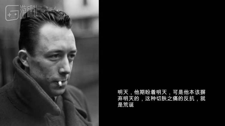 游戏的开头,耳机里传来法国作曲家埃里克·萨蒂(1866-1925)的钢琴曲《吉诺佩蒂》,屏幕上出现一张布列松拍摄的哲学家加缪(1913-1960)像,并配上了一段从加缪随笔《西西弗神话》中摘抄的句子: