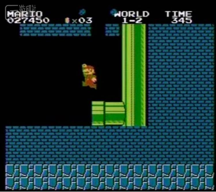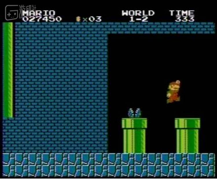 上图是正常的情况,马里奥是从版面上方走到Warp Zone,下落后,食人花变成关卡的数字。这是官方认定的跳关方法。