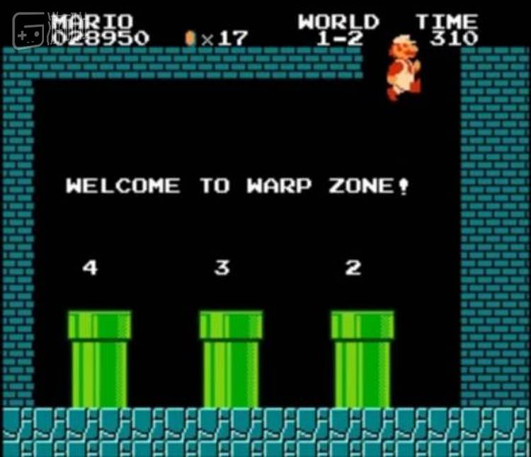 如果比较熟悉马里奥的玩家应该知道,没错,另一头正是那个非常有名的Warp Zone,可以用来跳关的水管地带。