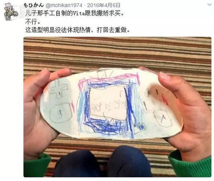 关于推主儿子制作纸模游戏机的来龙去脉,并不仅限于文章开头刷屏的那四张图。其实早在去年,推主的儿子就曾用同样的方式,向他的父亲“索要”过另一台游戏机——PSV。