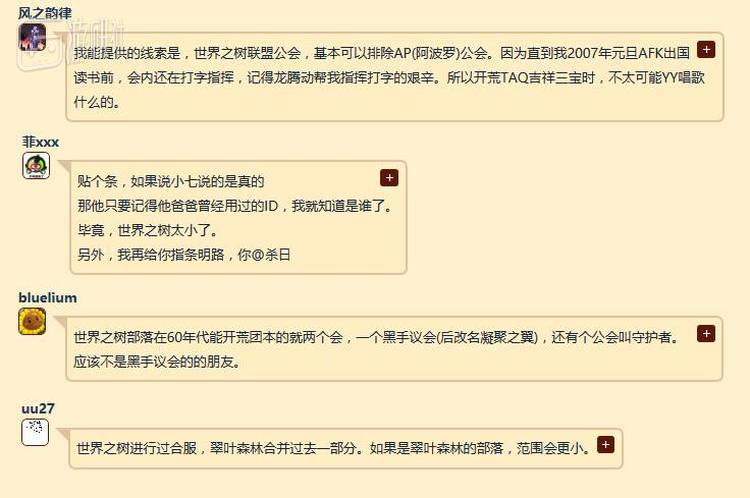 他们有的提供了相关人士的ID,有的回忆起世界之树服务器鼎盛期的几大公会,逐一排除。其中一些信息还勾起了小七本人的回忆。