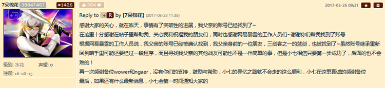 随着寻人启事微博原文被迅速转发、NGA的帖子有了上千网友回复,《魔兽世界》运营方网易暴雪的工作人员也注意到了此事,迅速提供了必要的帮助。