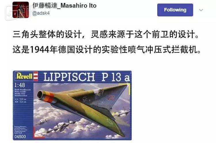 三角头整体形状,则来自于德国1944年的实验性冲压喷气式拦截机。